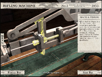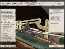 Although the rifling machine is historically interesting, the focus of the app is on the key mechanical elements that allow the machine to quickly and accurately cut the rifling on the inside of each barrel. The machine itself is animated to illustrate the interaction of all of the components during operation.